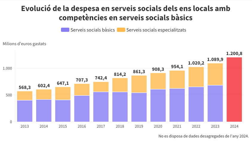 En conjunt, la despesa global en serveis socials va superar l’any 2024 els 1.200 milions, xifra que duplica la quantitat que hi destinaven una dècada enrere. Un augment del 110% que és molt superior al del conjunt de despeses no financeres (+59%) i ingressos no financers (+49%) de les mateixes administracions. El pes d’aquesta matèria en el pressupost total ha passat del 9,4% al 12,5% (un de cada vuit euros) i, amb l’envelliment progressiu de la població, no sembla que aquesta tendència s’hagi de revertir.