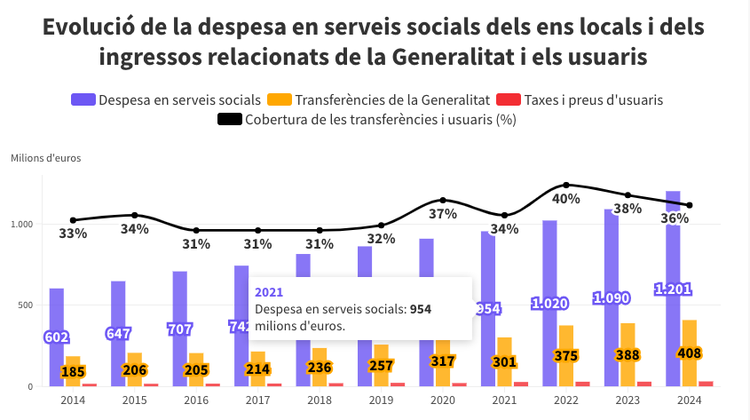 La majoria dels recursos per finançar aquestes polítiques provenen directament de les arques municipals. Davant dels 1.200 milions gastats en serveis socials, la Generalitat només va transferir 408 milions per al seu finançament i els usuaris van aportar uns altres 30 milions.