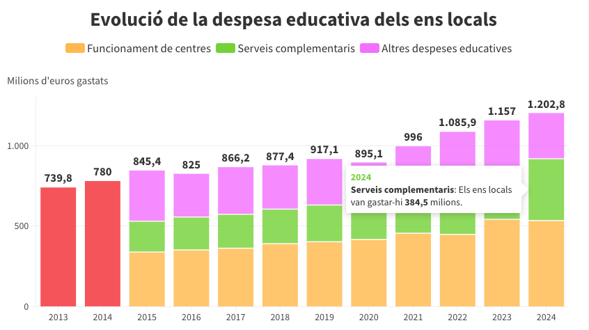 Per fer-ho, el pressupost que hi destinen ha crescut dels 740 milions fins als 1.203 milions, entre 2013 i 2024. D’aquests, la partida principal és el funcionament dels centres educatius de primer cicle d’educació infantil, amb 534 milions, però la que més ha augmentat és la de serveis complementaris —escoles de música, extraescolars, transport, ajudes a associacions de famílies…—. Aquesta s’ha duplicat fins als 385 milions, des del 2013, per enfortir l’educació més enllà del cicle formal i facilitar la participació i la conciliació de les famílies.