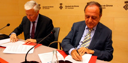 El president de la patronal CECOT i del centre ‘Reempresa’ de Catalunya, Antoni Abad, i el president de la Diputació de Girona, Joan Giraut, aquest dijous signant el conveni de col·laboració.