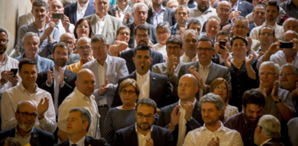 Alcaldes i alcaldesses en l’acte de suport al referèndum de l’1-O Foto: ALBERT SALAMÉ.