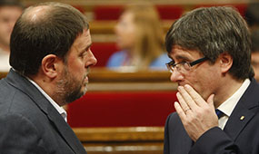 Oriol Junqueras i Carles Puigdemont, al Parlament, en el debat en què la CUP va votar contra la tramitació dels comptes d’enguany Foto: Oriol Duran.