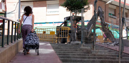 Una veïna del barri de Sant Crist utilitza l’actual rampa asfaltada del carrer de Cuba mentre comencen les obres de les rampes mecàniques.