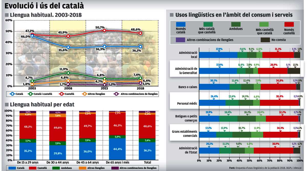 Sense un estat fort que la protegeixi, amb un model d’immersió lingüística caduc i la tossuda realitat que ha portat nous fluxos migratoris, la globalització econòmica, un creixement del turisme i una revolució tecnològica que afecta les maneres de consumir productes audiovisuals, entre altres, han encès les alarmes sobre l’estat de salut de la llengua catalana. El govern vol donar un tomb, 40 anys després, al model de política lingüística en constatar que “no hem assolit els mínims en què ens vam comprometre els primers anys de la democràcia” per aconseguir uns mínims de coneixement generalitzat i un ús normal del català. Ho deia la consellera de Cultura, Natàlia Garriga, en comissió parlamentària el 2 de juliol, i ho refermava divuit dies després al ple on exposava les línies mestres del Pacte Nacional per la Llengua que volen impulsar aquesta legislatura –debat que tot just obre als partits i entitats– que reverteixi aquesta situació i posin al dia els “mecanismes de promoció i protecció de la llengua en tots els àmbits”.