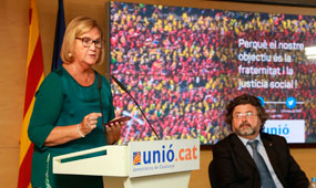 La presidenta del Parlament i integrant del sector sobiranista d’Unió, Núria de Gispert, aquest dilluns en roda de premsa, al costat d’Antoni Castellà.