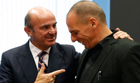 El ministre espanyol d’Economia, Luis de Guindos, amb el ministre grec de Finances, Ianis Varoufakis, a Luxemburg.