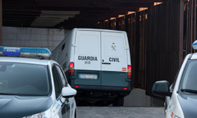 El furgó policial que transporta els detinguts, arribant aquest dijous al matí al Jutjat del Vendrell. Foto: ACN.