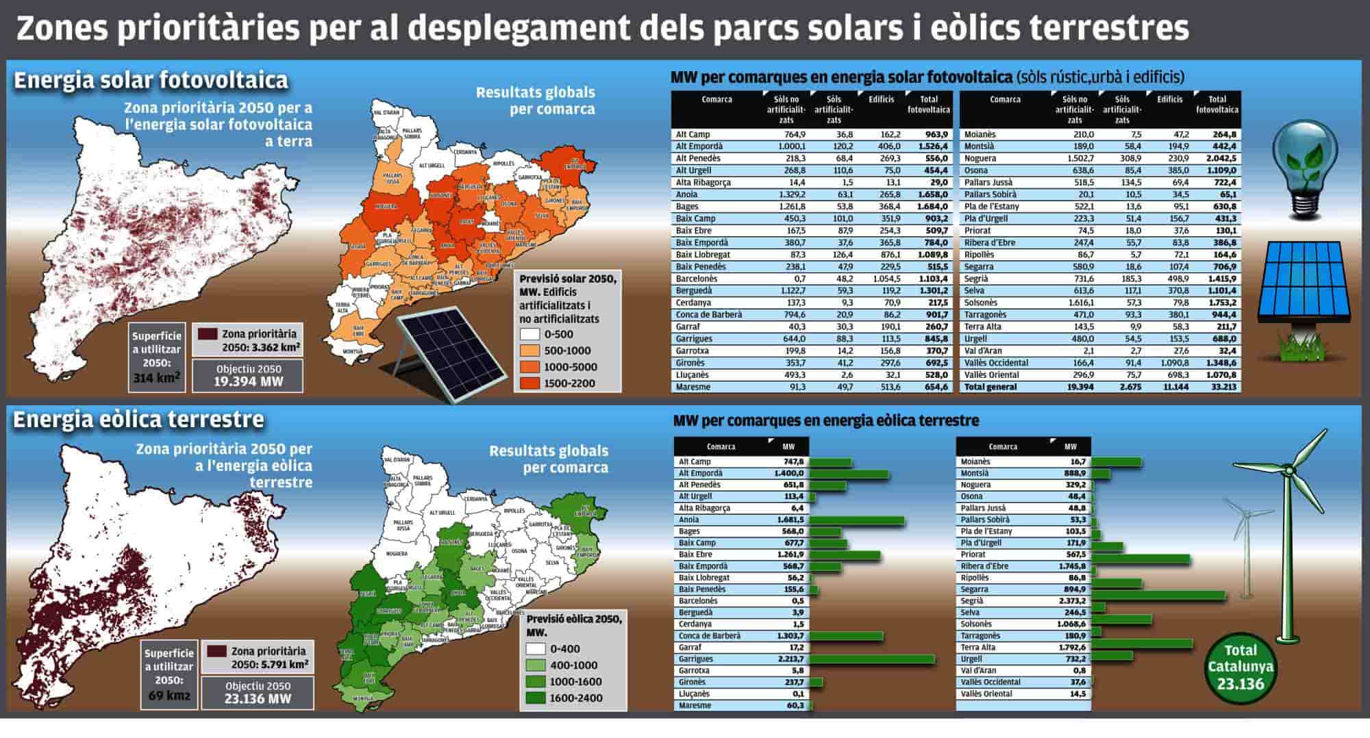 El pla territorial sectorial per a la implantació de les energies renovables (Palter) del govern de Salvador Illa preveu un desplegament massiu tenint en compte que l’objectiu és assolir els 15.384 MW en cinc anys (2030) i els 61.861 MW l’any 2050. Un desplegament que es fa amb un model totalment diferent, perquè s’estableixen uns mínims de producció fotovoltaica i eòlica municipi a municipi, que podran decidir en quins terrenys la instal·len. Però es defineixen unes zones prioritàries i es preveuen passadissos per a les línies d’alta tensió perquè, finalment, els ajuntaments puguin adaptar la seva normativa urbanística al mapa final. El desplegament arreu del territori es justifica amb l’argument que als edificis i sòls urbanitzables només es podran instal·lar 14.000 MW dels 62.000 de la futura demanda energètica de Catalunya, que es considera que es multiplicarà per 2,3 fins al 2050 encara que es redueixi un 30% el consum –això és així perquè la descarbonització implica que no només se substitueix la generació elèctrica actual nuclear i gasista, sinó que s’electrifiquen la indústria i el transport que avui funcionen amb petroli i derivats i representen la majoria de consum energètic del país. El resultat és que la potència que s’haurà d’instal·lar en renovables en terrenys rústics (forestals, matollars, pastures i agrícoles) serà de 48.000 MW, ocupant un 1,2% de la superfície del país.
