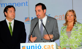 El president del Consell Nacional d’Unió, Ramon Espadaler, ha fet pública la continuïtat de Josep Antoni Duran i Lleida com a secretari general de CiU. La resta de membres de la Permanent d’Unió (Josep Maria Pelegrí i Joana Ortega a la imatge) l’han acompanyat a la sala de premsa del partit.
