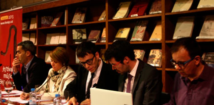 Jordi Sellas, Director General de Creació i Empreses Culturals, Albert batalla, Alcalde de la Seu d’Urgell, RAmon Villuendas, Alcalde d’ESterri d’Àneu, Josep Maria Dutrèn, Director del FeMAP i Rosa Pujol, Vicepresidenta de l’Institut dEstudis Llerdencs durant la roda de premsa d’aquest dijous.