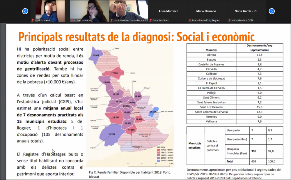 Tot seguit, l’Observatori DESC va presentar els resultats de l’estudi “Caminem cap a un parc d’habitatge social al Baix Llobregat”, document que conté una diagnosi de la situació de l’habitatge a la comarca, i propostes d’actuació per augmentar el parc d’habitatge social al Baix Llobregat.