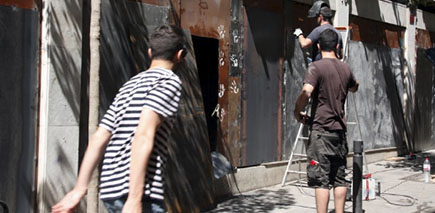 Uns operaris reforcen amb planxes metàl·liques el blindatge del Banc Expropiat Foto: ACN.