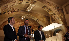 EL Conseller Vila, el 5 de juliol sota les pintures murals de Sixena al MNAC, objecte d’un altre litigi. Foto: ACN.