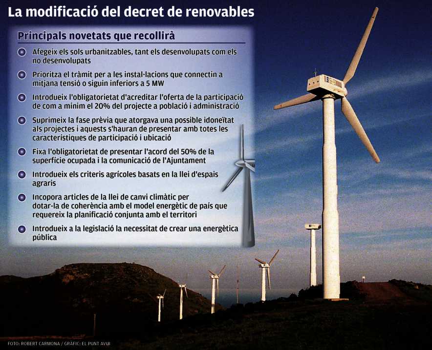 El govern té previst aprovar dimarts la modificació del decret de renovables, que vol fer partícip el territori dels nous projectes de parcs eòlics i fotovoltaics per minimitzar l’impacte social. La consellera d’Acció Climàtica, Teresa Jordà, va anunciar al juliol la intenció del govern d’esmenar el decret llei 16/2019 amb l’objectiu que la transició energètica es pugui desenvolupar de manera distribuïda i descentralitzada, tal com va explicar ahir ella mateixa juntament amb el president de la Generalitat durant la presentació del full de ruta energètic amb l’horitzó al 2050. Aragonès va situar la transició energètica com una de les prioritats del govern.