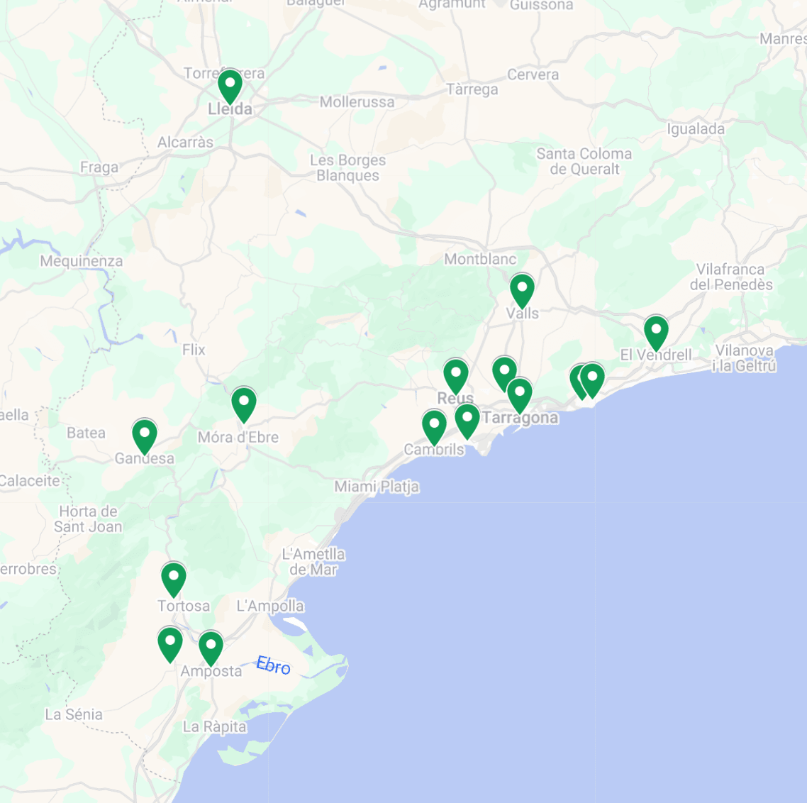 Llista de les 18 localitats seleccionades: L’Aldea, Altafulla, Amposta, Cambrils, Constantí, Gandesa, Lleida, Montbrió del Camp, Móra la Nova, Reus, Salou, Santa Bárbara, Tarragona, Torredembarra, Valls i El Vendrell.