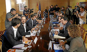 Les delegacions de C´s (esquerra de la taula) i PP (dreta) es van asseure per negociar l´acord. Foto: Paco Campos/EFE.