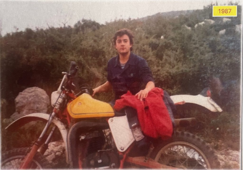 La segona foto és de 1987. Jo em volia menjar el món. Era guapo, prim, tenia una moto sense carnet i podia anar sense casc, si volia (riu). Aquella sensació de llibertat me la representa aquesta foto amb la colla dels amics.