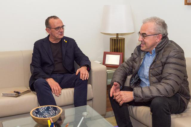 Imatge de la reunió entre el paer en cap, Miquel Pueyo, i l’alcalde de les Borges, Enric Mir, a la Paeria.