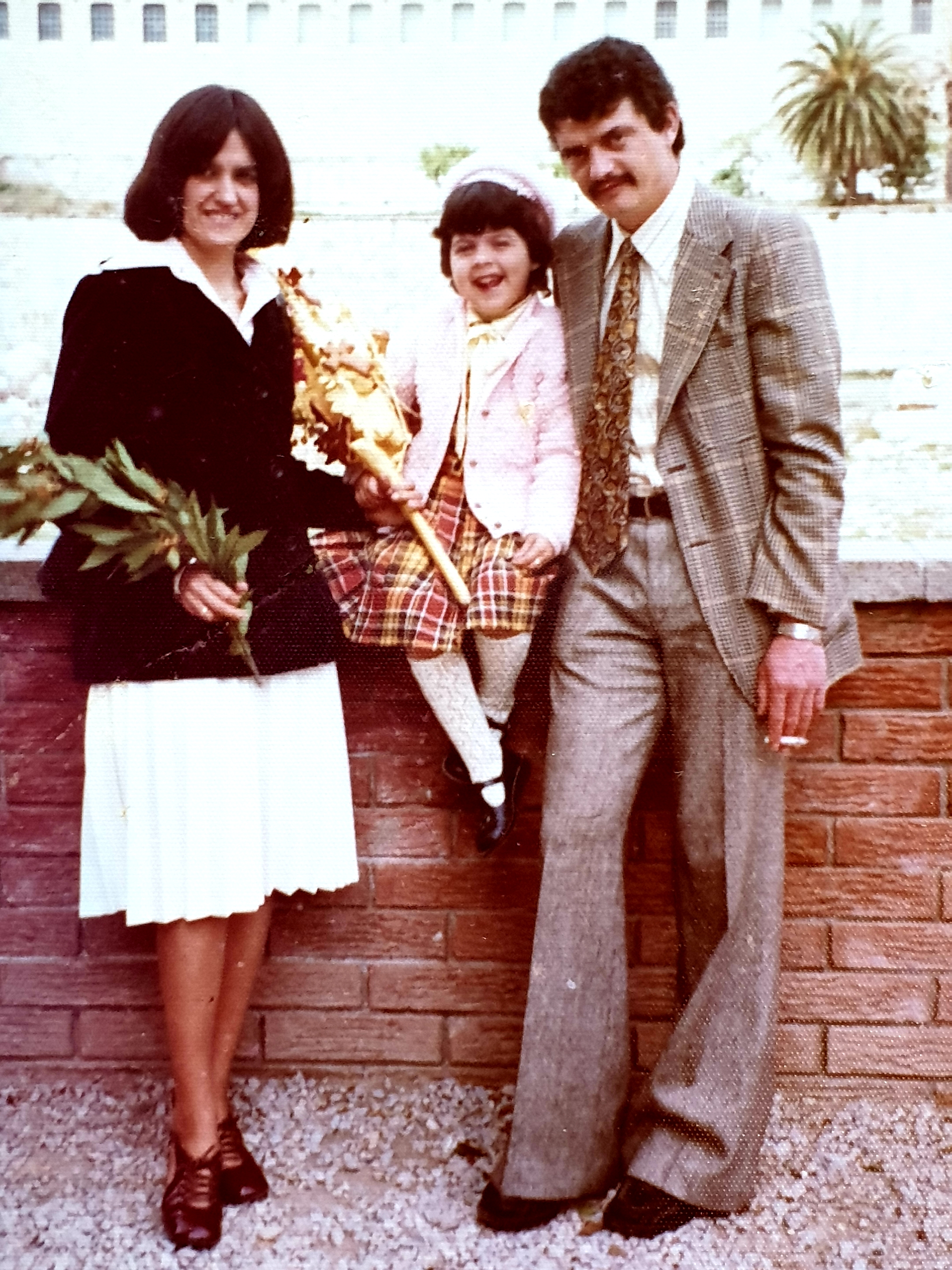 M’agraden les fotografies on hi apareixen les mirades. Una de les que he triat em mostra a mi, de petita, mirant-me els meus pares. Per a mi són els meus pilars. Fa un parell de mesos que el meu pare va morir i ara justament estic en un moment sensible. Sempre el tinc present i a prop, no només pel que m’ha donat, sinó per tot l’ajut que encara em dona. És com si em pogués ajudar. De vegades, en moments de solitud, al despatx, busco en ell la serenitat i el reconfort. La fotografia és d’una diada de Rams, al poble, amb un vestit que la meva iaia m’havia cosit fins el darrer moment.