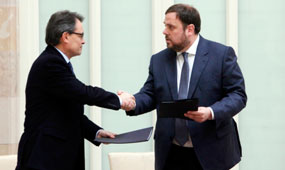 El president de la Generalitat, Artur Mas, i el líder d’ERC, Oriol Junqueras, escenifiquen l’acord d’estabilitat, al Parlament de Catalunya, el passat 19 de desembre de 2012.