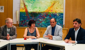 El president del Consell Comarcal, Josep Perpinyà, acompanyat de la consellera de Dones, Gent Gran i LGBTI, Vicky Castellanos, el conseller de Polítiques de Benestar i Desenvolupament Social, Xavi Paz, i del psiquiatra i psicoanalista, Josep Moya, han presentat el nou Servei Especialitzat d’Atenció a les Persones (SEAP) posat en marxa aquest mes de juny de 2018.