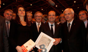 El president francès, François Hollande, ha vistat aquest dijous el Saló del Llibre de París, la fira literària més important de França amb Barcelona com a ciutat convidada en l’edició d’enguany. En el dia de la inauguració del certamen, Hollande s’ha retratat amb el conseller de Cultura, Ferran Mascarell, i amb l’alcalde de Barcelona, Xavier Trias, entre altres, exhibint un detall de Barcelona i el llibre ‘Imago Cataloniae’, un volum editat per la Generalitat amb un compendi de mapes sobre Catalunya des del final de l’Edat Mitjana fins als temps moderns. 24 autors contemporanis que escriuen en català i en castellà seran a París juntament amb els clàssics sota el lema ‘Barcelona, ville des prodiges’.