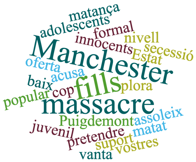 “elPeriódico” obre portada amb la “Massacre juvenil” de Manchester, “La Razón” parla de “Massacre d’innocents“; el diari “Ara” destaca que “Manchester plora els seus fills” i “El Mundo” ressalta que “L’IS es vanta de la matança d’adolescents a Manchester“, alhora que el diari “ABC” transmet el missatge dels terroristes: “Hem matat els vostres fills”.