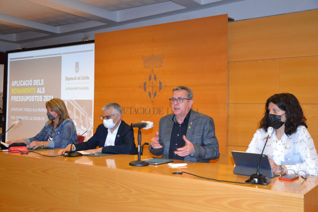 El president de la Diputació de Lleida, Joan Talarn, acompanyat del vicepresident primer, Jordi Latorre, i de les portaveus dels grups d’ERC i JxCat, Mercè Carulla i Rosa Pujol, respectivament, ha presentat aquest dimecres en roda de premsa l’aplicació dels romanents de Tresoreria al pressupost 2021 de la Diputació.