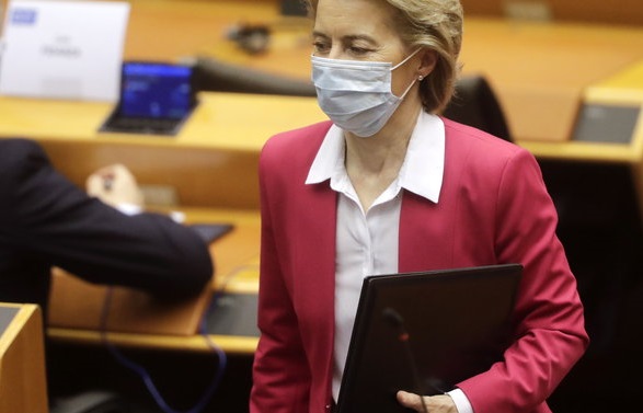 La presidenta de la Comissió Europea, Ursula von der Leyen, a punt de presentar ahir la proposta, que a partir del 19 de juny debatran els estats. Foto: EFE.