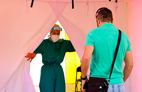 Una sanitària obre una carpa del SEM a Terrassa mentre un noi accedeix a fer-se la prova PCR. Foto: EPA.