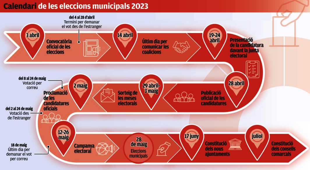 El 28 de maig hi ha eleccions municipals, i si bé la maquinària preparatòria ja fa mesos que s’ha posat en marxa, el calendari oficial de l’administració (vegeu gràfic) s’engega tot just avui. En efecte, el Ministeri de l’Interior va aprovar ahir la convocatòria, que a partir de la seva publicació avui en el Butlletí oficial de l’Estat (BOE) enceta un període electoral que s’allargarà fins a la mateixa nit dels comicis. D’entrada, això vol dir per exemple que des d’avui, 4 d’abril, i fins al dia 29, ja es pot demanar el vot des de l’exterior, però implica sobretot un seguit de restriccions als ajuntaments, que no podran convocar cap acte finançat amb fons públics que al·ludeixi a les realitzacions o èxits obtinguts amb la seva gestió. Per exemple, queden prohibides genèricament les campanyes institucionals i les inauguracions d’obres o serveis públics, però no la seva posada en funcionament, ni, arribat el cas, els anuncis informatius “imprescindibles” per fer-ho saber.