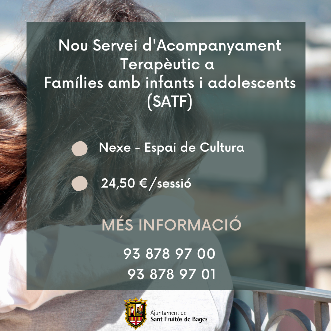 L’Ajuntament de Sant Fruitós de Bages ha impulsat el SATF, el Servei d’Acompanyament Terapèutic a Famílies amb infants i adolescents, per tal de treballar per la millora de les dificultats relacionals, emocionals i educatives que afecten un o més membres, en especial si es tracta d’infants o adolescents.