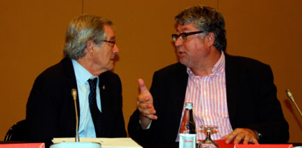 El president de l’AMB i alcalde de Barcelona, Xavier Trias, i el vicepresident executiu de l’AMB i alcalde de Cornellà, Antonio Balmón, conversant després de la roda de premsa de balanç.