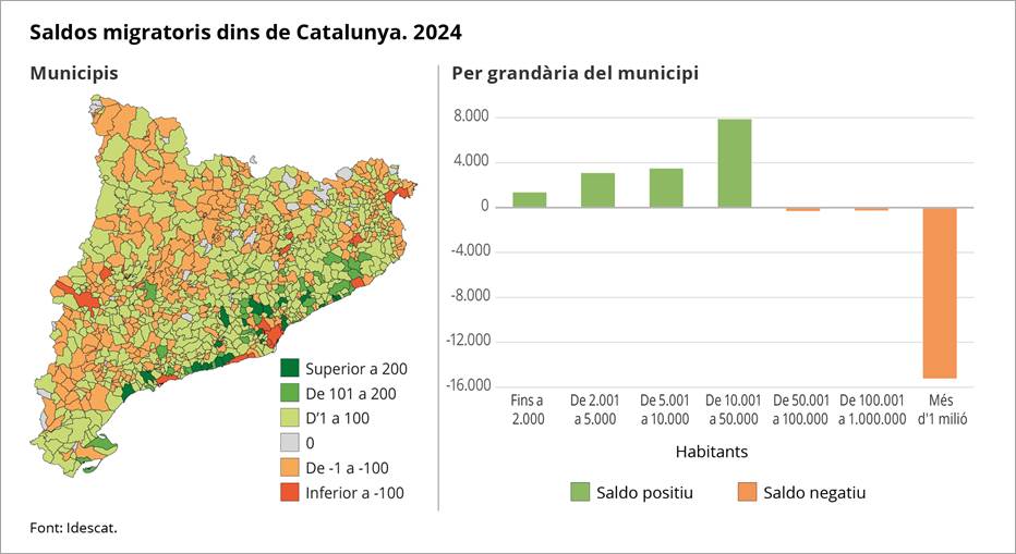 Per grandària del municipi, el conjunt de municipis de menys de 50.000 habitants ha registrat un saldo positiu de 15.785 persones (entrades menys sortides), en què destaquen, principalment, els de 10.001 a 50.000 habitants (7.876 persones). En canvi, el conjunt de municipis de més de 50.000 habitants ha registrat un saldo negatiu (‑15.785 persones), concentrat pràcticament tot a la ciutat de Barcelona (‑15.221 persones).