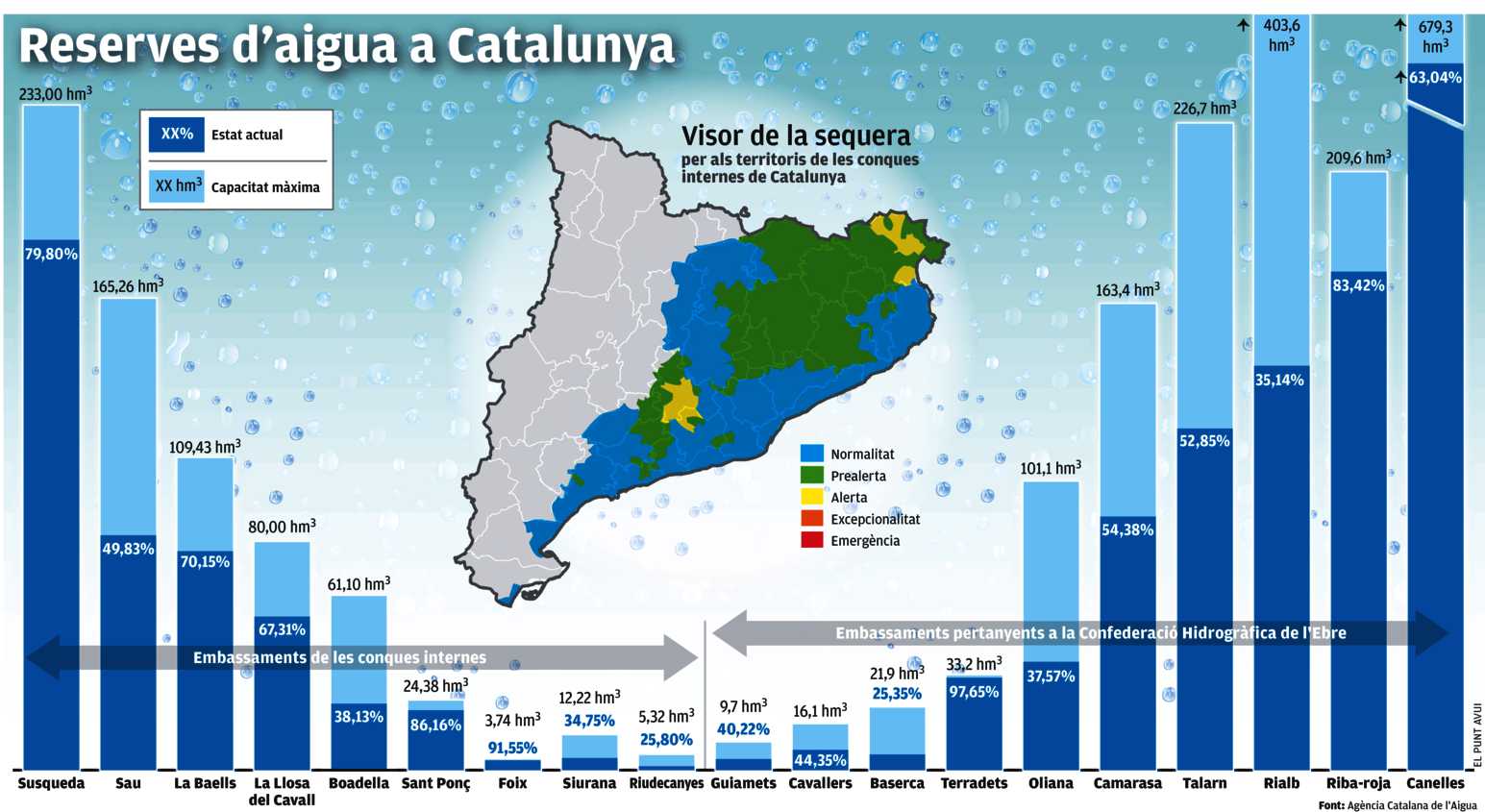 Els embassaments de les conques internes catalanes han reduït en prop d’un 18% el volum d’aigua el darrer any i estan ara al voltant del 65% del total de la seva capacitat. Als aqüífers també es nota la davallada. La disminució dels nivells d’aigua dels de Carme-Capellades, a l’Anoia, i del Fluvià-Muga, que abasteix 22 municipis de l’Alt Empordà, ha portat a declarar la situació d’alerta per sequera en tots dos casos, ja que s’ha arribat a estar per sota del 40% de les reserves. Aquest és el primer pas que marca el pla de sequera a fi d’anticipar-se i fixar mesures per alentir el descens de les reserves d’aigua.