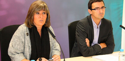 L’alcaldessa de l’Hospitalet, Núria Marín, i el seu soci en el govern local, el portaveu d’ICV-EUiA, Alfons Salmerón, en la roda de prensa per explicar les inversions públiques fins a final de mandat.