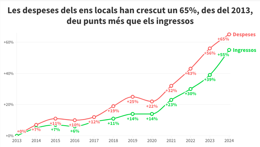 Des del 2013, les despeses no financeres dels ens locals han crescut un 65%, deu punts més que els ingressos no financers. Malgrat que les transferències van créixer l’any 2024, el diferencial entre el cost dels serveis i els recursos per sufragar-los segueix sent notable. I el retorn de les regles fiscals condiciona més les arques. Algunes de les dades que posa de manifest l’actualització de l’Observatori són les següents: