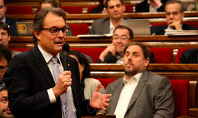 Artur Mas, president de la Generalitat, parla al ple del Parlament, sota la mirada d’Oriol Junqueras, líder d’ERC.