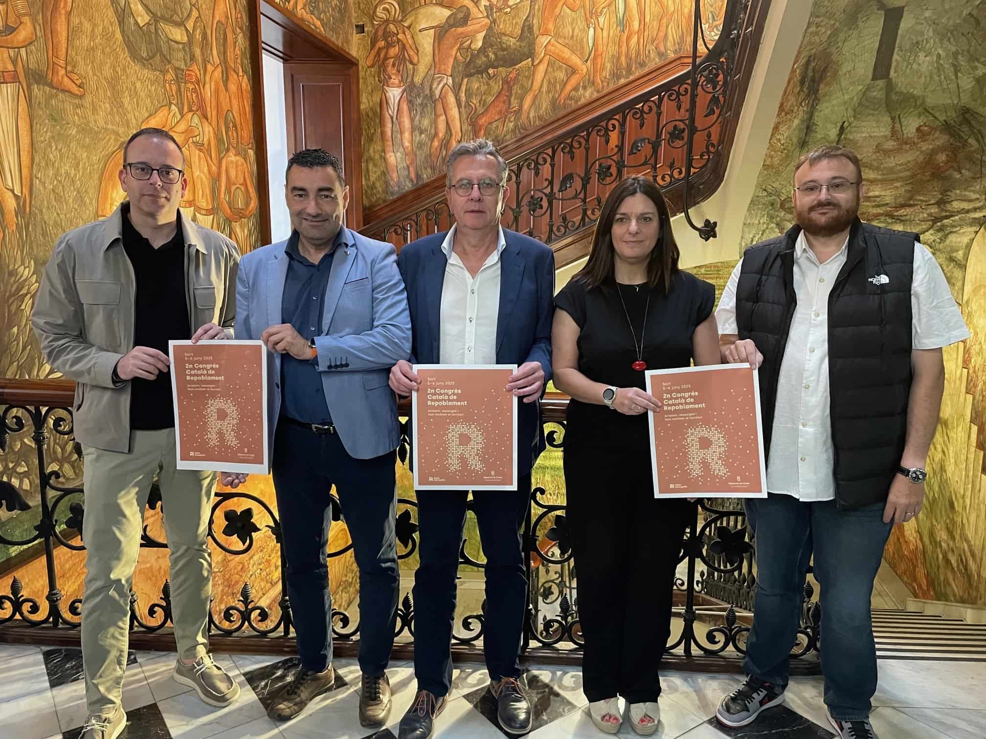 El president de la Diputació de Lleida, Joan Talarn; el vicepresident, Agustí Jiménez; la primera tinent d’alcalde de l’Ajuntament de Sort, Maleni Barbero; el vicepresident de l’Associació Catalana de Municipis (ACM), Gerard Sabarich, i el vicepresident de la Federació de Municipis de Catalunya (FMC), Marc Solsona, han presentat aquest dijous el 2n Congrés Català de Repoblament, que se celebrarà els dies 5 i 6 de juny al Cinema-Teatre Els Til·lers de Sort, amb el títol ‘Arrelem, ressorgim i fem renéixer el territori’.