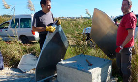 Els tècnics de l’IRTA instal·len un dels equips per mesurar la subsidència que pateix el delta de l’Ebre.