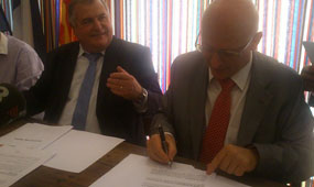 François Calvet i Jordi Vera signant els acord entre UMP i CDC al Soler.