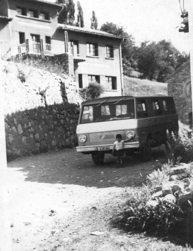 La primera l’he triada perquè és de quan jo era molt petit. Estic davant del primer taxi que hi va haver a Saldes, que era el cotxe del meu pare, precisament. Va suposar un abans i un després al poble, perquè les comunicacions van millorar molt.