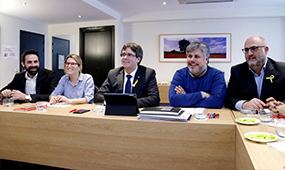 El líder de JxCat, Carles Puigdemont, amb els diputats de JxCat Elsa Artadi, Albert Batet i Eduard Pujol a Brussel·les, al gener de 2018. Foto: EPA/ACN.