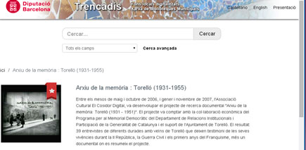Així, per exemple, s’hi pot descobrir el naixement del barri barceloní de Canyelles a través de les seves fotografies, escoltar testimonis sobre la guerra civil i els primers anys del franquisme a Torelló a través d’entrevistes a gent gran del municipi, consultar els programes de festa major de la Colònia Güell des de 1903 o accedir a una col·lecció de premsa local des del segle XIX ordenada per municipis.