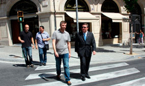 El regidor d’Espai Públic de l’Ajuntament de Sabadell, Cristian Sánchez, i el director de l’ONCE a Sabadell, Luis Fernando San Martín, (en primer terme) creuant el pas de vianants on s’han instal·lat els nous semàfors.