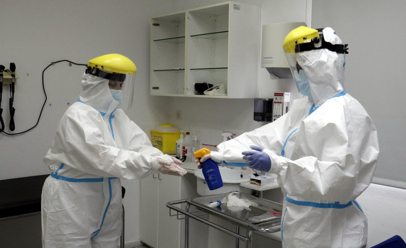 Professionals d’un CAP de Girona es desinfecten els guants després d’extreure mostres per a la prova PCR. Foto: ACN.